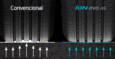 El peso de la batería hace que los vehículos eléctricos sean hasta un 30 % más pesados que los vehículos con motor de combustión interna (ICE), lo que con frecuencia provoca un desgaste desigual de las llantas que no son específicas para vehículos eléctricos. La iON evo AS logra una presión de contacto uniforme optimizando la estructura de contacto y ofrece una vida útil general con un desgaste uniforme de la banda de rodamiento.