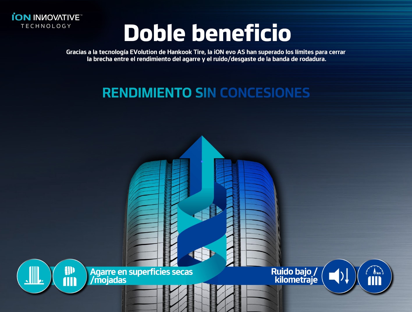 Gracias a la iON INNOVATIVE TECHNOLOGY de Hankook Tire, la iON evo AS ha superado los límites para cerrar la brecha entre el rendimiento del agarre y el ruido/desgaste de la banda de rodamiento.