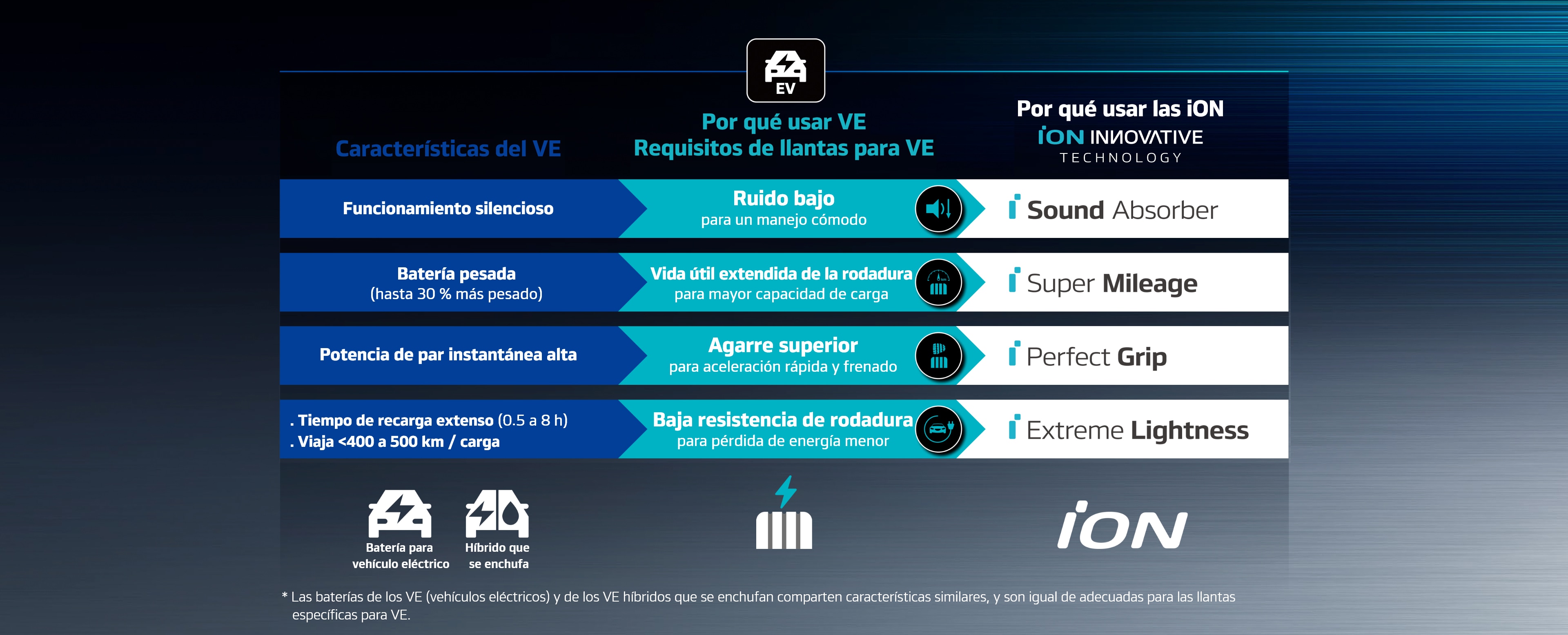 El peso de las baterías hace que los vehículos eléctricos sean 30 % más pesados que los vehículos con motor de combustión interna (ICE), lo que a menudo produce un desgaste irregular de las llantas. La iON ST AS SUV está hecho de un compuesto ProDurable diseñado específicamente para vehículos eléctricos a fin de extender la vida útil de las llantas. La iON evo distribuye la presión de la carretera de manera uniforme gracias a la tecnología Round Even.