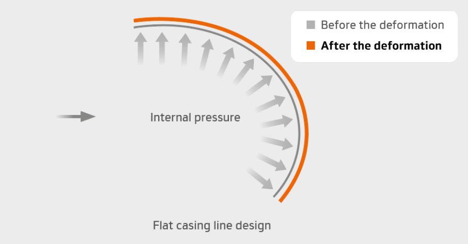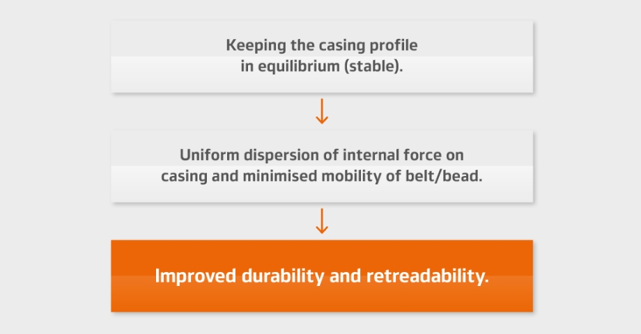 SCCT is designed for constant profile deformation. If the casing profile cannot be kept constant, the internal force on the casing will be concentrated on a specific point (belt edge or turned up casing edge). In contrast, SCCT controls the dispersion of internal forces for better durability.